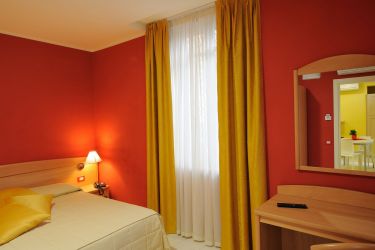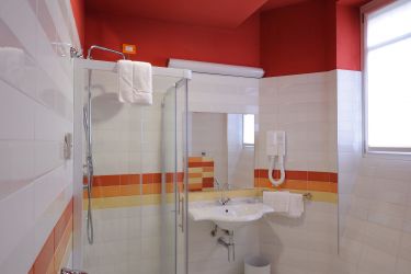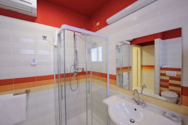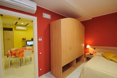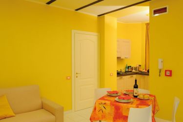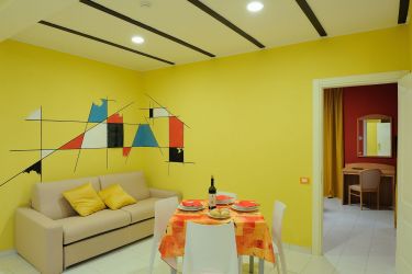 The furniture and the walls are mainly red and yellow, which give a lively and modern appearance to the interiors.